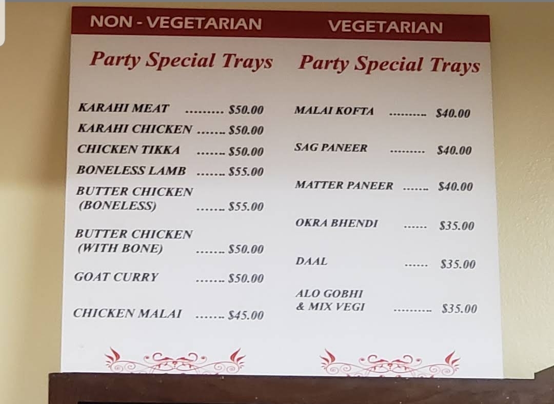 Tandoori lovers can enjoy a range of Tandoori Chicken options, from a Qtr Chicken to a hearty Full Chicken, all grilled to perfection. For those hosting gatherings, the Party Special Trays offer large portions of dishes like Karahi Meat, Karahi Chicken, Chicken Tikka, Boneless Lamb, and Butter Chicken, making them a great choice for sharing.